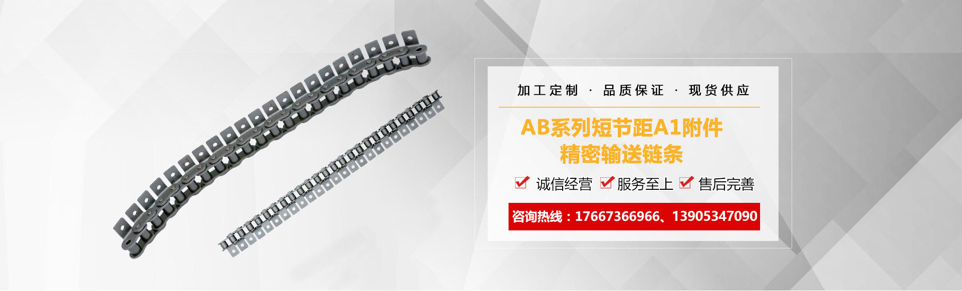 1、鏈條產品有各種不銹鋼、碳鋼輸送鏈條、雙節距輸送鏈條、空心銷軸鏈條、不銹鋼塑料平頂鏈、不銹鋼精密滾子鏈、特殊工礦輸送鏈、耐高溫輸送鏈條、非標鏈條、彎板非標鏈條、大節距輸送鏈條、各種鏈條用滾子(材質碳鋼、不銹鋼)等。